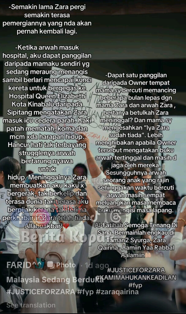 ” Semoga arwah dpt keadilan ramai doakan awak Zara syg anak syurga Amin.. rakyat malaysia bersama kamu dik. rakyat membela nasib rakyat.. “