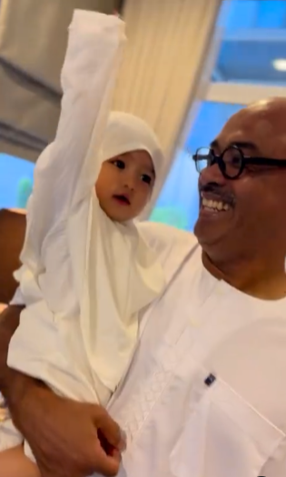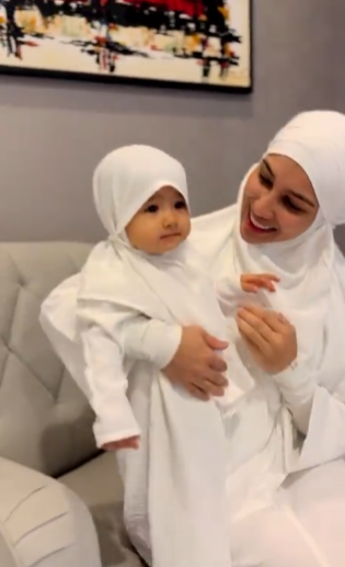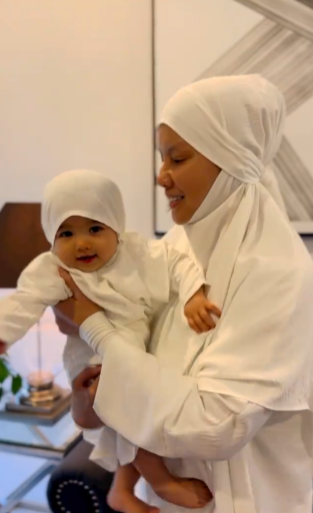 Bunga juga turut memakai jubah dan tudung berwarna putih. Kecomelan Bunga ini membuatkan ramai peminat yang tidak puas melihat Bunga. Anak solehah mommy dan daddy yang terlajak comel sering membuatkan ramai yang ger4m dengan kecomelannya.