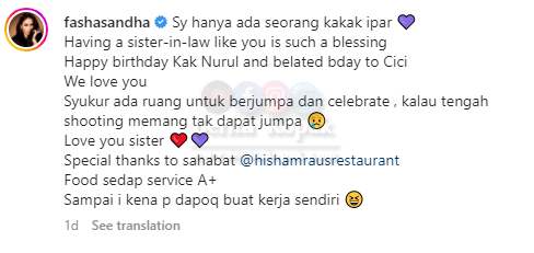 Menurut Fasha, dia hanya mempunyai seorang sahaja kakak ipar dalam keluarga di sebelah suaminya iaitu Aidil Aziz. Jadi di kesempatan yang ada Fasha telah mengambil peluang untuk meraikan hari lahir kakak iparnya itu.