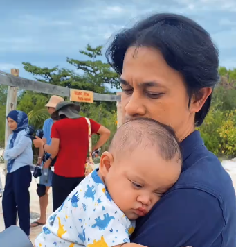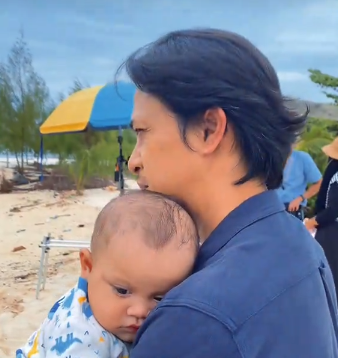 Set penggambaran di tepi pantai memang menenangkan dengan deruan ombak. Baby Noah pula seronok terlentuk di atas bahu Zahiril. Dapat dilihat Zahiril menghalakan kipas ke arah baby Noah supaya baby Noah tidak kepanasan. Mungkin cuaca dan angin pantai agak panas pada ketika itu.