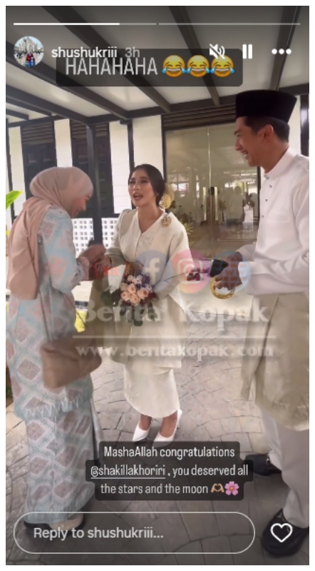 Dapat juga dilihat menerusi Instastory bekas isteri kepada pelakon Hafidz Roshdi, Nurul Shuhada yang turut diundang sebagai tetamu wajah suami Shakilla yang dikenali sebagai Fariz. Cerah dan tinggi orangnya, sama cantik sama padan, bagai pinang dibelah dua.