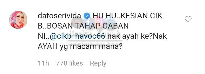 Komen daripada Dato’ Seri Vida ini telah mendapat ratusan respon balas yang menghiburkan. Ada juga yang menawarkan diri untuk menjadi ayah Cik B. Ad0iii, sempat lagi ye netizen-netizen sekalian membuat hiburan di kala kita kena duduk di rumah.
