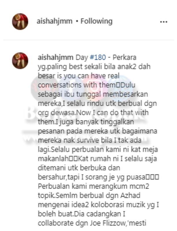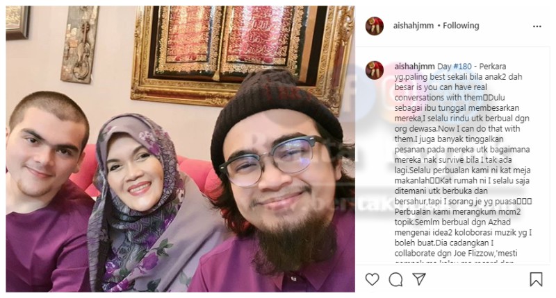 Jika dahulu mereka masih kecil dan tidak boleh dijadikan teman untuk berbual namun kini sudah menjadi seperti kawan-kawan pada ibunya ini. Aishah turut bercerita tentang cadangan anaknya Azhad supaya Aishah membuat kolaborasi bersama penyanyi Joe Flizzow untuk projek akan datang.