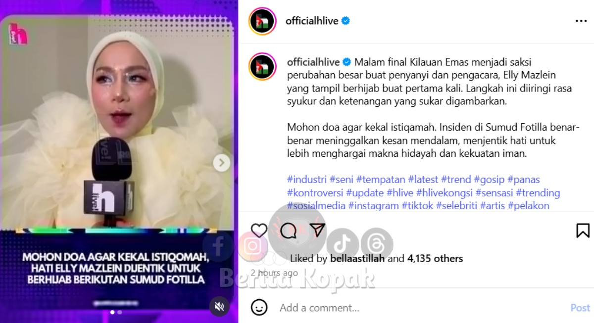 Video Elly Mazlein tampil berhijab di pentas final Kilauan Emas 2025 curi perhatian ramai. Sampai menangis Kak Lina mengenangkan srikandi dan wira negara Sumud Flotilla. Asbab GSF, Kak Lina akhirnya berhijab, semoga terus istiqamah..