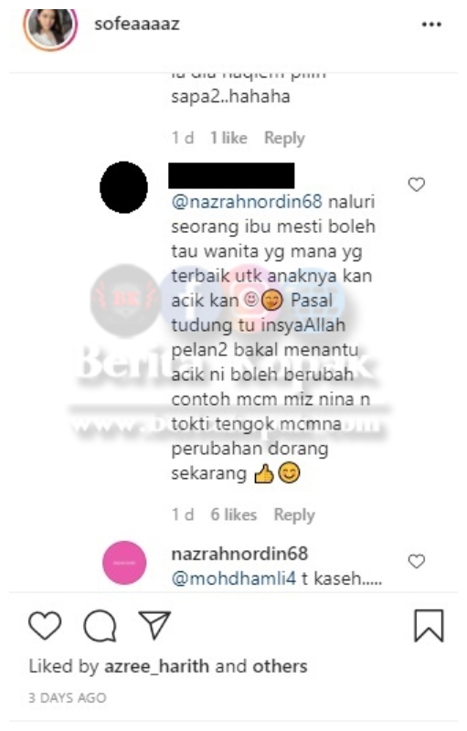 Menariknya, Ibu Haqiem bernama Nazrah Nordin meninggalkan emoji senyum pada ruangan komen Sofea dan turut dilihat berbal4s komen dengan netizen sehinggakan membuatkan netizen tertanya-tanya samada Sofea merupakan bakal menantunya atau tidak.