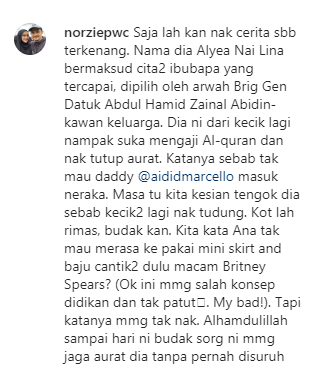 Menerusi perkongsian terbaru,Norzie telah berkongsi cerita tentang anak sulungnya, Alyea Nai Lina pada suatu ketika dahulu,ketika usia anaknya kecil sudah mahu memakai tudung. Namun bagi Norzie,beliau risau akan anaknya tidak selesa.