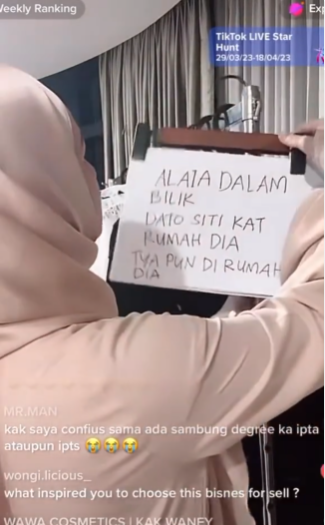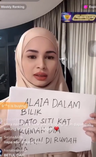 Dengan tulisan yang besar dan terang, Izara menulis pada sekeping kertas tertulis ‘ Alaia Dalam Bilik, Dato Siti Kat Rumah Dia, Tya Pun Di Rumah Dia ‘. Kata Izara, follower Tikt0knya jenis masuk air, kalau tidak dijawab nanti dikatakan somb0ng.