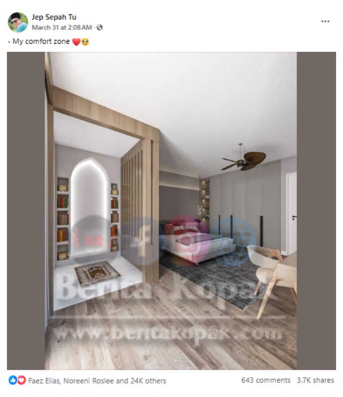 Pada ruangan kapsyennya pula tertulis ayat berbunyi ‘ My comfort zone ‘. Bilik Jep ini jika dilihat dari gambar memiliki ruang yang luas dan besar. Tidak hanya dilengkapi dengan katil, almari dan meja solek, bilik ini juga tersedia ruangan solat tersendiri.