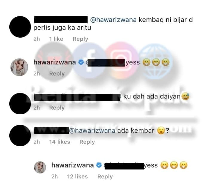 Dapat dilihat di ruangan komen, Hawa membal4s pertanyaan netizen yang bertanyakan soalan berkaitan gambar tersebut dan juga sempat berseloroh mengatakan lelaki tersebut kembarnya.