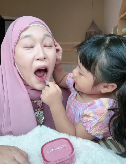 Selepas itu, Rina juga meletakkan lipstik di bibir Maryam dan sedikit di bahagian pipi untuk dijadikan pemerah pipi. Sekali lagi, perkongsian mengenai gelagat Rina ini telah menarik perhatian warganet. Ramai yang memuji Rina seorang anak yang bijak dan hasil makeupnya juga kelihatan cantik.