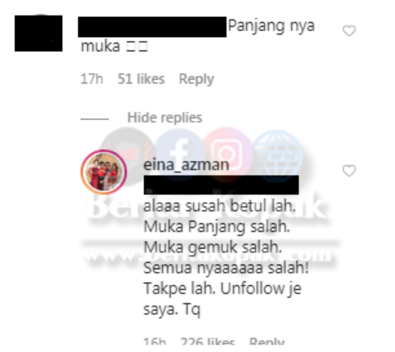 Namun ada juga yang mengkrit1k penampilan Datin Eina. Komen ini mendapat respon daripada Datin Eina sendiri.