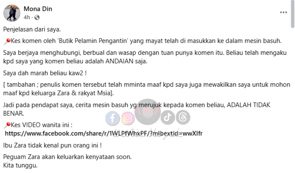 Perkongsian Puan Mona Din mengenai komen pemilik akaun Butik Pelamin Pengantin dan video live viral berkenaan isu adik Zara Qairina dimasukkan dalam mesin basuh. Tak sangka itu sebenarnya..