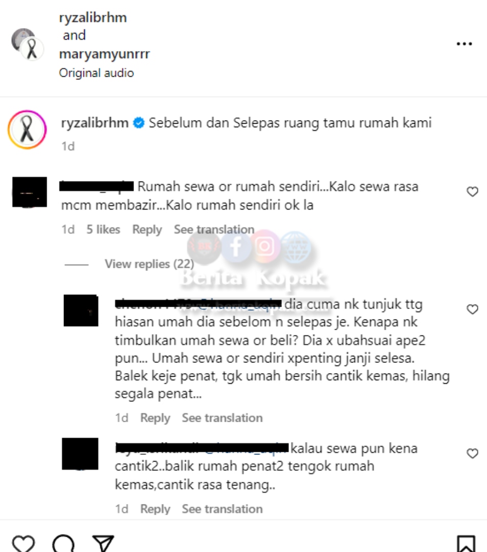 Sehingga kini, video ruang tamu rumah Ryzal dan Maryam menerima ribuan tanda suka sejak ia dimuatnaik ke akaun Instagram. Ada yang memuji ruang tamu rumah pasangan ini cantik. Antara komen-komen menarik adalah :