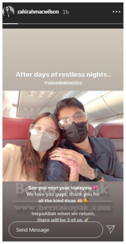 Meninjau akaun Instagram story Zahirah, telah dikongsikan sekeping gambarnya bersama Aiman di dalam pesawat. Ira yang menulis kapsyennya berbunyi jumpa lagi Malaysia tahun hadapan dan mereka akan kembali bertiga bersama si kecil.