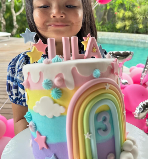 Sambutan tahun ini agak ringkas namun tetap dihiasi dengan dekorasi belon berwarna pink. Kek hari lahir Lila juga sangat comel bertemakan warna pelangi. Lila pula memakai baju gaun berwarna biru dan sedondon dengan kakaknya, Lara Alana.