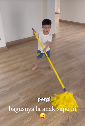 Dapat dilihat, Isaac sedang memegang sebatang mop dan mengemop lantai. Menyedari Aiman ingin melalui kawasan itu, Isaac pantas memberi peringatan supaya daddynya tidak lalu di situ kerana licin. Prihatin dengan keselamatan daddy walaupun masih kecil.
